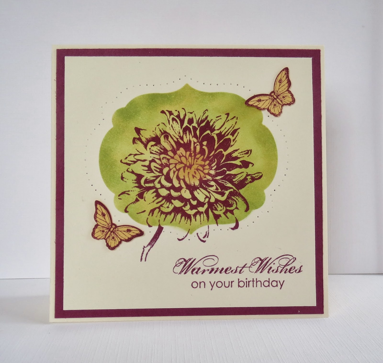 Jacqueline had aangegeven dat ze het leuk vond om iets met een bloemen stempel en bijpassende pons te maken. Vlinders vond ze ook leuk.